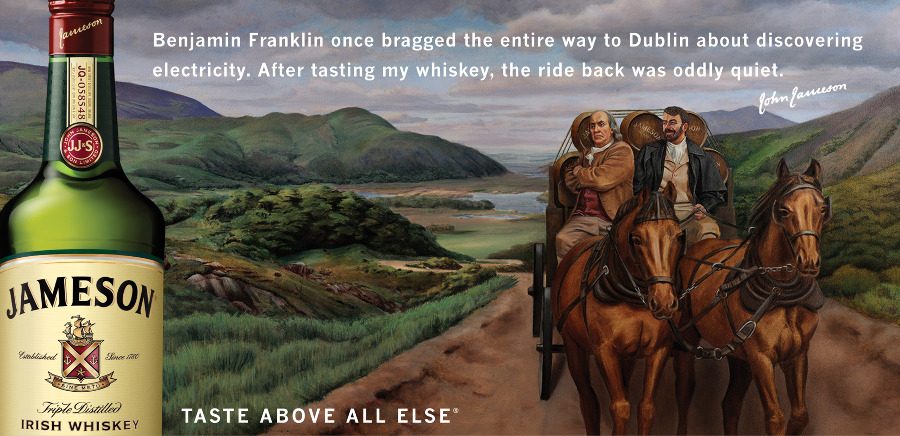 When I was thinking of ads that grabbed my attention recently, Jameson's new subway ads came to mind. I saw them in New York over break, and the subway car was lined with multiple Jameson ads, each with a different scenario. They all painted a picture of the type of man John Jameson was, along with touting the "Taste Above All Else" tagline. I was struck by the clever copy, and saw the brand was trying to create a picture of its founder, while insinuating a picture of its users. Below are two examples of what I saw on the subway: